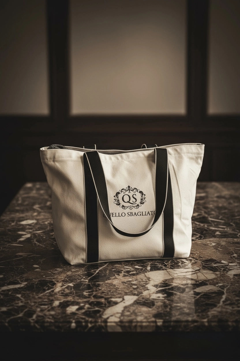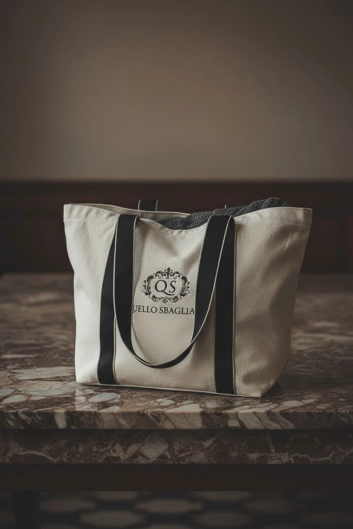 Borsone da viaggio con il logo di Quello Sbagliato. In tela di cotone 100%. Il borsone è dotato di una cerniera in metallo dorato per chiudere la borsa. Taschina di sicurezza interna con cerniera. Foderato internamente. Funzionale ed elegante.