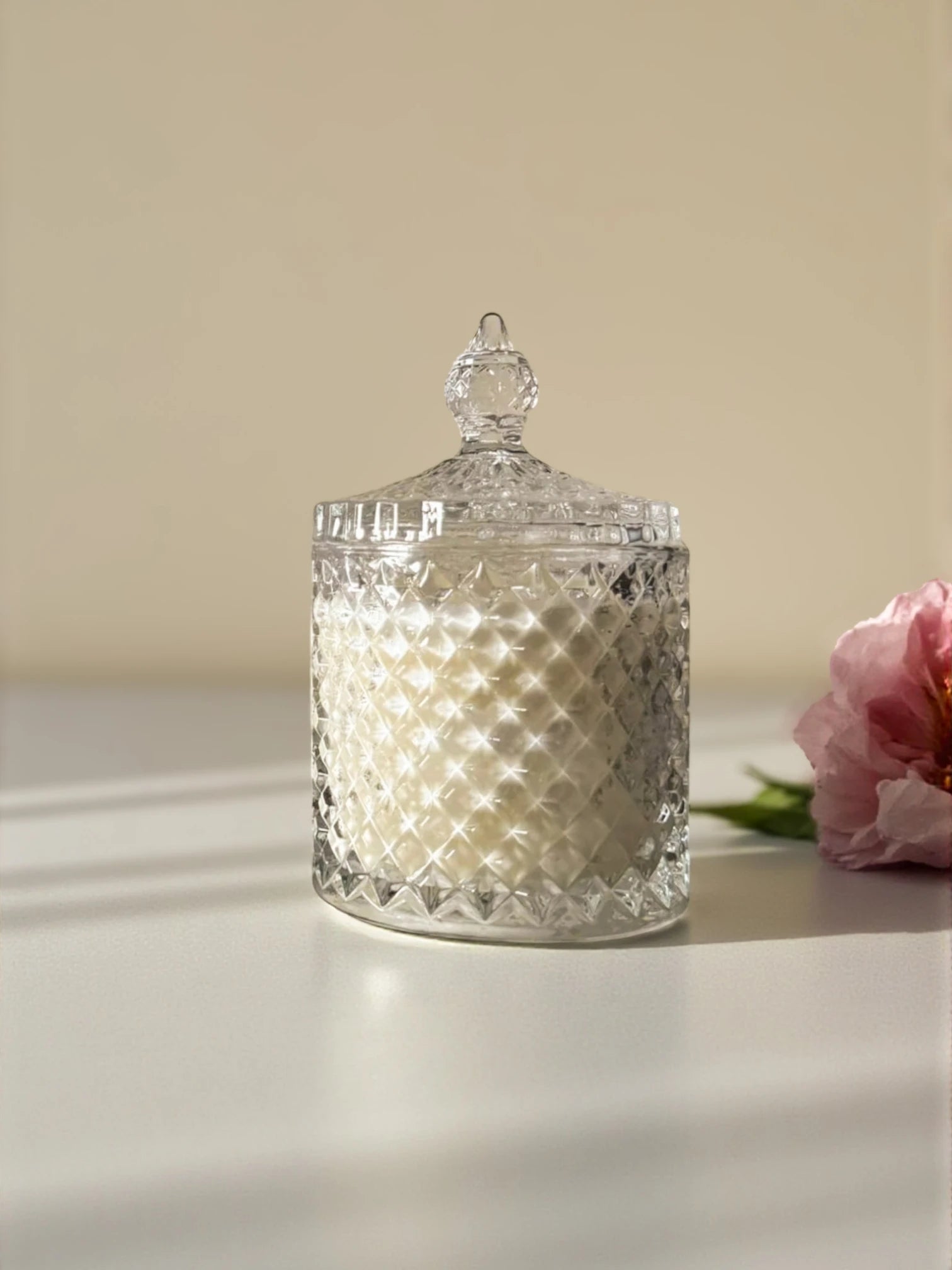 La candela è contenuta in un elegante contenitore di vetro lavorato con coperchio in vetro.